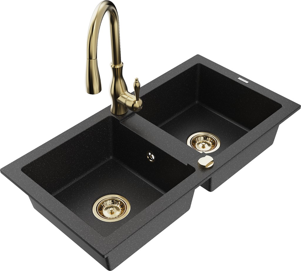 Technická data: dřez: Rozměr: 820 x 436 x 161 mm Hloubka komory: 151 mm Rozměry komory: 356x336 mm Průměr odtoku: ø90 mm Typ: 2-komorový Typ: Zapuštěné do pracovní desky Barva: černá/stříbrná metalíza Povrchová úprava sifonu: zlatá Materiál: žula (80 % žulové kamenivo, 20 % pryskyřice) Přepadový otvor: Ano Otvory: (baterie, automatické) 2 Vysoká odolnost proti poškrábání a změně barvy Odolnost proti tepelným šokům Snadno čistitelný povrch kuchyňská baterie: Materiál: mosaz Barva: Zlatá Hlava: Keramická Provzdušňovač: Ano Typ: Jedna páka Výška baterie: 410 mm Rozsah výtoku: 231 mm