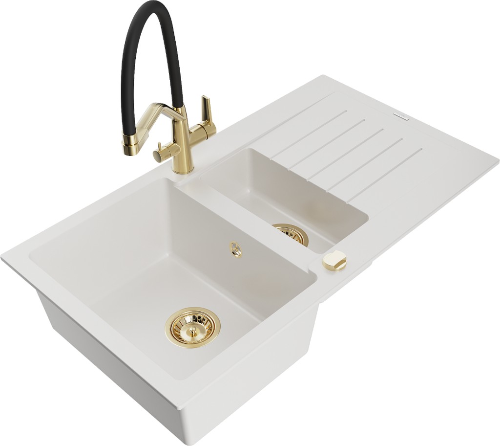 Technická data: dřez: Rozměr: 900x505x200mm Hloubka komory: 180 mm (větší), 115 mm (menší) Rozměry komory: 435x335 mm (větší), 345x150 mm (menší) Průměr odtoku: ø90 mm Typ: 1,5-miska s krátkým odkapávačem Typ: Zapuštěné do pracovní desky bílá barva Povrchová úprava sifonu: zlatá Materiál: žula (80 % žulové kamenivo, 20 % pryskyřice) Přepadový otvor: Ano Otvory: (baterie, automatické) 2 Instalace: Univerzální, lze instalovat s odkapávačem na levou nebo pravou stranu Vysoká odolnost proti poškrábání a změně barvy Odolnost proti tepelným šokům Snadno čistitelný povrch Dva dodatečné vyfrézované otvory pro samoděrování ø35 kuchyňská baterie: Materiál: mosaz Povrchová úprava: zlatá/černá Hlavy: Keramické Provzdušňovač: Ano Typ hubice: Flexibilní s mosazným držákem Rozsah výtoku: 260 mm Výška: 405 mm Typ: Dvě rukojeti Dvouhlavá baterie s přídavným kanálem pro filtrovanou pitnou vodu