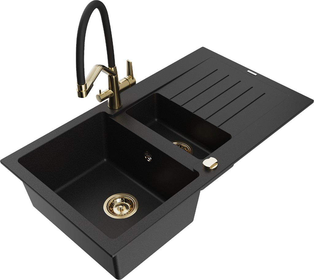 Technická data: dřez: Rozměr: 900x505x200mm Hloubka komory: 180 mm (větší), 115 mm (menší) Rozměry komory: 435x335 mm (větší), 345x150 mm (menší) Průměr odtoku: ø90 mm Typ: 1,5-miska s krátkým odkapávačem Typ: Zapuštěné do pracovní desky Černá barva Povrchová úprava sifonu: zlatá Materiál: žula (80 % žulové kamenivo, 20 % pryskyřice) Přepadový otvor: Ano Otvory: (baterie, automatické) 2 Instalace: Univerzální, lze instalovat s odkapávačem na levou nebo pravou stranu Vysoká odolnost proti poškrábání a změně barvy Odolnost proti tepelným šokům Snadno čistitelný povrch Dva dodatečné vyfrézované otvory pro samoděrování ø35 kuchyňská baterie: Materiál: mosaz Povrchová úprava: zlatá/černá Hlavy: Keramické Provzdušňovač: Ano Typ hubice: Flexibilní s mosazným držákem Rozsah výtoku: 260 mm Výška: 405 mm Typ: Dvě rukojeti Dvouhlavá baterie s přídavným filtrem na pitnou vodu