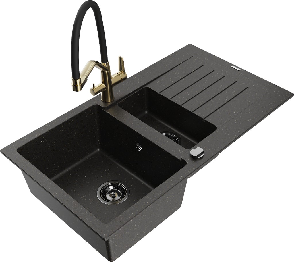 Technická data: dřez: Rozměr: 900x505x200mm Hloubka komory: 180 mm (větší), 115 mm (menší) Rozměry komory: 435x335 mm (větší), 345x150 mm (menší) Průměr odtoku: ø90 mm Typ: 1,5-miska s krátkým odkapávačem Typ: Zapuštěné do pracovní desky Barva: černá/zlatá metalíza Povrchová úprava sifonu: černá Materiál: žula (80 % žulové kamenivo, 20 % pryskyřice) Přepadový otvor: Ano Otvory: (baterie, automatické) 2 Instalace: Univerzální, lze instalovat s odkapávačem na levou nebo pravou stranu Vysoká odolnost proti poškrábání a změně barvy Odolnost proti tepelným šokům Snadno čistitelný povrch Dva dodatečné vyfrézované otvory pro samoděrování ø35 kuchyňská baterie: Materiál: mosaz Povrchová úprava: zlatá/černá Hlavy: Keramické Provzdušňovač: Ano Typ hubice: Flexibilní s mosazným držákem Rozsah výtoku: 260 mm Výška: 405 mm Typ: Dvě rukojeti Dvouhlavá baterie s přídavným filtrem na pitnou vodu