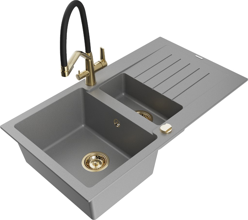 Technická data: dřez: Rozměr: 900x505x200mm Hloubka komory: 180 mm (větší), 115 mm (menší) Rozměry komory: 435x335 mm (větší), 345x150 mm (menší) Průměr odtoku: ø90 mm Typ: 1,5-miska s krátkým odkapávačem Typ: Zapuštěné do pracovní desky Šedá barva Povrchová úprava sifonu: zlatá Materiál: žula (80 % žulové kamenivo, 20 % pryskyřice) Přepadový otvor: Ano Otvory: (baterie, automatické) 2 Instalace: Univerzální, lze instalovat s odkapávačem na levou nebo pravou stranu Vysoká odolnost proti poškrábání a změně barvy Odolnost proti tepelným šokům Snadno čistitelný povrch Dva dodatečné vyfrézované otvory pro samoděrování ø35 kuchyňská baterie: Materiál: mosaz Povrchová úprava: zlatá/černá Hlavy: Keramické Provzdušňovač: Ano Typ hubice: Flexibilní s mosazným držákem Rozsah výtoku: 260 mm Výška: 405 mm Typ: Dvě rukojeti Dvouhlavá baterie s přídavným kanálem pro filtrovanou pitnou vodu
