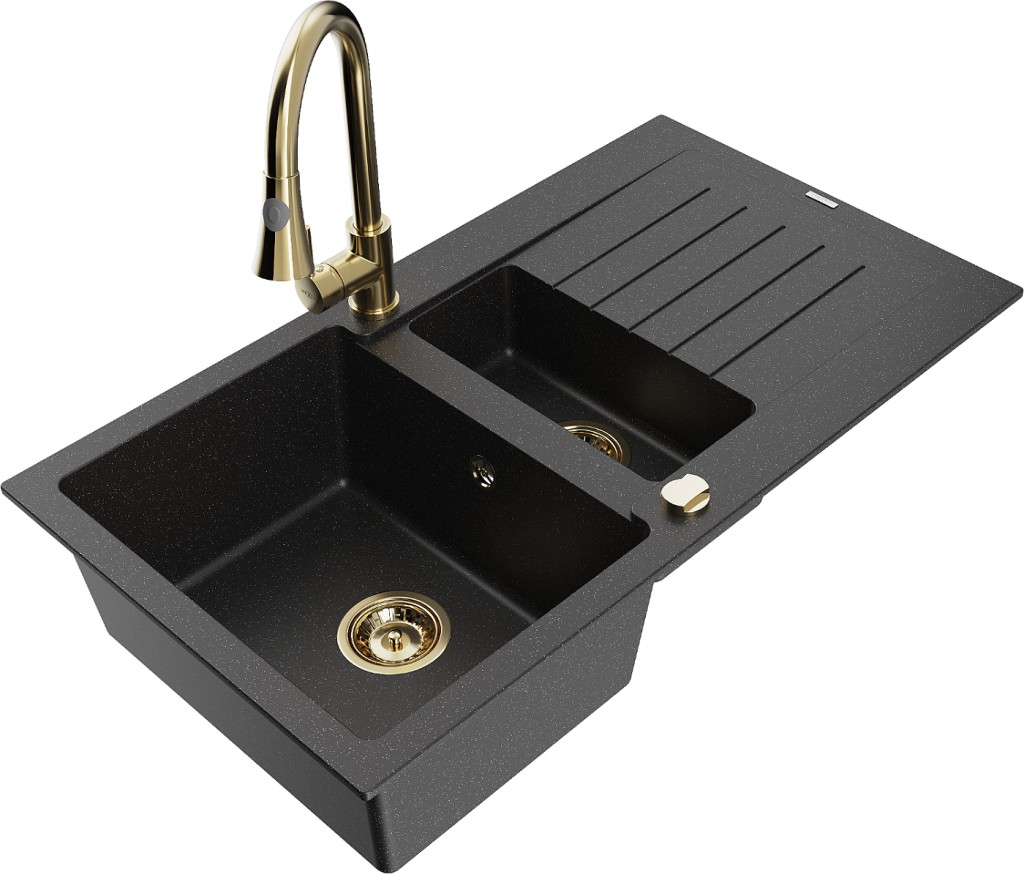 Technická data: dřez: Rozměr: 900x505x200mm Hloubka komory: 180 mm (větší), 115 mm (menší) Rozměry komory: 435x335 mm (větší), 345x150 mm (menší) Průměr odtoku: ø90 mm Typ: 1,5-miska s krátkým odkapávačem Typ: Zapuštěné do pracovní desky Barva: černá/stříbrná metalíza Povrchová úprava sifonu: zlatá Materiál: žula (80 % žulové kamenivo, 20 % pryskyřice) Přepadový otvor: Ano Otvory: (baterie, automatické) 2 Instalace: Univerzální, lze instalovat s odkapávačem na levou nebo pravou stranu Vysoká odolnost proti poškrábání a změně barvy Odolnost proti tepelným šokům Snadno čistitelný povrch Dva dodatečné vyfrézované otvory pro samoděrování ø35 kuchyňská baterie: Materiál: mosaz Barva: Zlatá Hlava: Keramická Provzdušňovač: Ano Typ: Jedna páka Výška baterie: 380 mm Rozsah výtoku: 252 mm Typ výtoku: Výsuvný