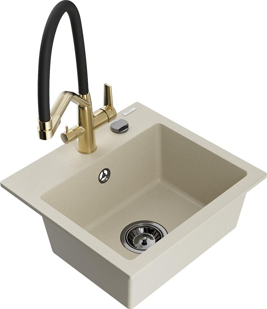 Technická data: dřez: Rozměr: 435x410x171mm Hloubka komory: 161 mm Rozměry komory: 375x280 mm Průměr odtoku: ø90 mm Typ: 1-komorový Typ: Zapuštěné do pracovní desky Barva béžová Povrchová úprava sifonu: černá Materiál: žula (80 % žulové kamenivo, 20 % pryskyřice) Přepadový otvor: Ano Otvory: (baterie, automatické) 2 Vysoká odolnost proti poškrábání a změně barvy Odolnost proti tepelným šokům Snadno čistitelný povrch Jeden dodatečný vyfrézovaný otvor pro samoděrování ø35 kuchyňská baterie: Materiál: mosaz Barva: Zlatá/Černá Hlavy: Keramické Provzdušňovač: Ano Typ hubice: Flexibilní s mosazným držákem Rozsah výtoku: 260 mm Výška: 405 mm Typ: Dvě rukojeti Dvouhlavá baterie s přídavným filtrem na pitnou vodu