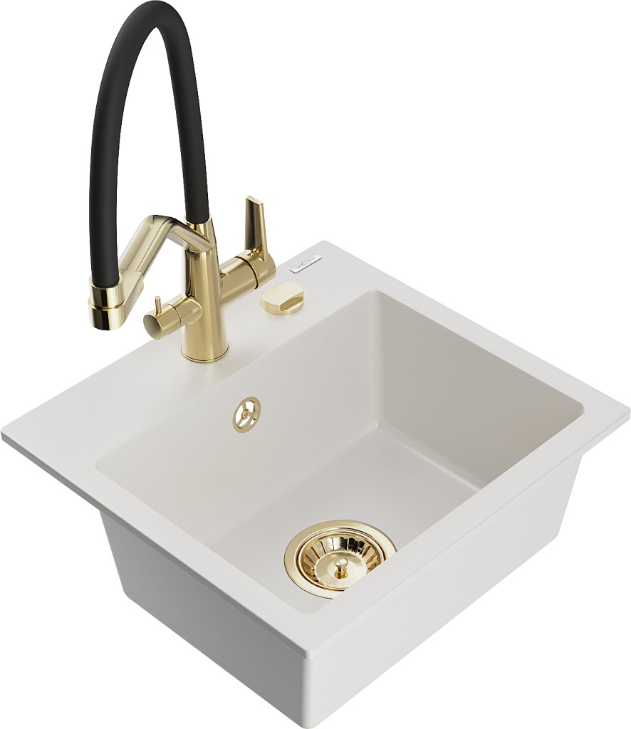 Technická data: dřez: Rozměr: 435x410x171mm Hloubka komory: 161 mm Rozměry komory: 375x280 mm Průměr odtoku: ø90 mm Typ: 1-komorový Typ: Zapuštěné do pracovní desky bílá barva Povrchová úprava sifonu: zlatá Materiál: žula (80 % žulové kamenivo, 20 % pryskyřice) Přepadový otvor: Ano Otvory: (baterie, automatické) 2 Vysoká odolnost proti poškrábání a změně barvy Odolnost proti tepelným šokům Snadno čistitelný povrch Jeden dodatečný vyfrézovaný otvor pro samoděrování ø35 kuchyňská baterie: Materiál: mosaz Barva: Zlatá/Černá Hlavy: Keramické Provzdušňovač: Ano Typ hubice: Flexibilní s mosazným držákem Rozsah výtoku: 260 mm Výška: 405 mm Typ: Dvě rukojeti Dvouhlavá baterie s přídavným filtrem na pitnou vodu