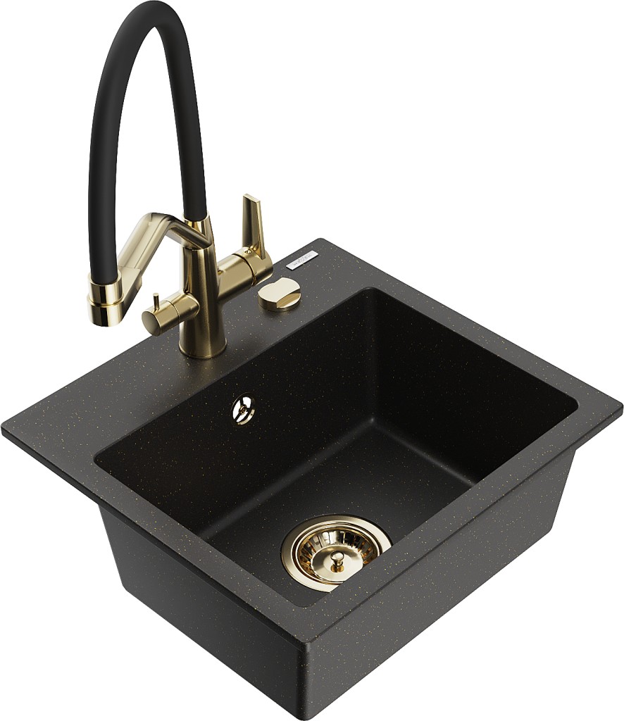 Technická data: dřez: Rozměr: 435x410x171mm Hloubka komory: 161 mm Rozměry komory: 375x280 mm Průměr odtoku: ø90 mm Typ: 1-komorový Typ: Zapuštěné do pracovní desky Barva: černá/zlatá metalíza Povrchová úprava sifonu: zlatá Materiál: žula (80 % žulové kamenivo, 20 % pryskyřice) Přepadový otvor: Ano Otvory: (baterie, automatické) 2 Vysoká odolnost proti poškrábání a změně barvy Odolnost proti tepelným šokům Snadno čistitelný povrch Jeden dodatečný vyfrézovaný otvor pro samoděrování ø35 kuchyňská baterie: Materiál: mosaz Barva: Zlatá/Černá Hlavy: Keramické Provzdušňovač: Ano Typ hubice: Flexibilní s mosazným držákem Rozsah výtoku: 260 mm Výška: 405 mm Typ: Dvě rukojeti Dvouhlavá baterie s přídavným filtrem na pitnou vodu