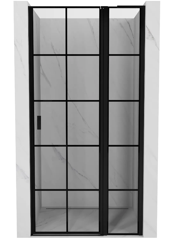 Specifikace produktu: Rozměr: 100x200 cm Strana montáže: Pravá Vchod: Výklopný Barva skla: Černá mřížka Povrchová úprava: Černá Profil: Hliník L-úhlový stabilizátor: nerezová ocel Typ skla: Tvrzené Tloušťka skla: 6 mm Snadno čistitelný povlak Možnost nastavení šířky Lze namontovat na sprchovou vaničku nebo dlaždice Mechanismus zvedání a spouštění dveří Magnetický proužek a elastomerová těsnění pro odvod vody Hliníkový práh těsnění dveří