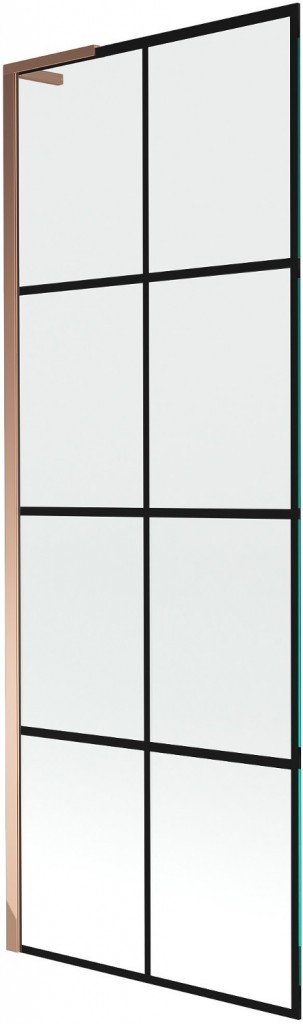 Technické údaje: Šířka: 70 cm Výška: 150 cm 1-křídlový typ Instalace: Univerzální Typ: Trvalý Typ skla: Tvrzené Barva skla: Černý vzor Tloušťka skla: 6 mm Povrchová úprava: růžové zlato L-úhlový stabilizátor: Nerezová ocel Povlak pro snadné čištění Vyrovnání nerovností stěny