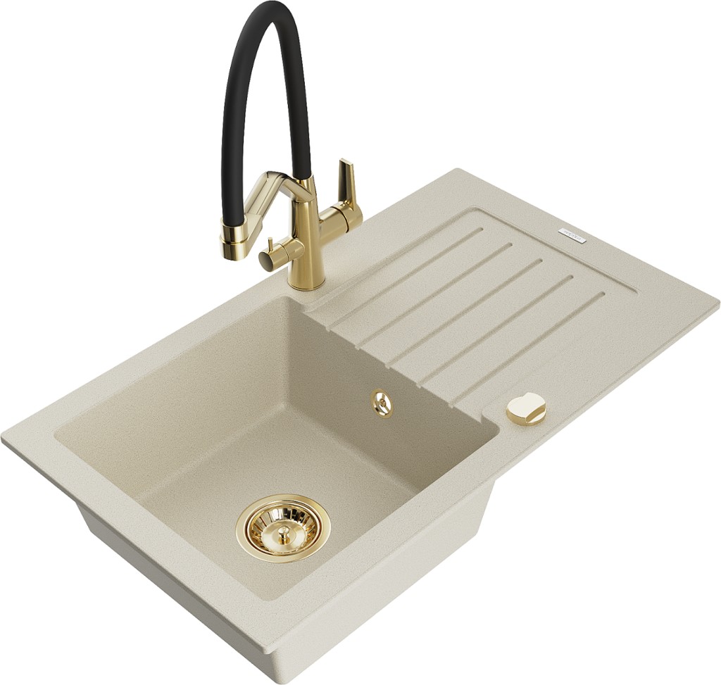 Technická data: dřez: Rozměr: 752 x 436 x 161 mm Hloubka komory: 151 mm Rozměry komory: 356x332 mm Průměr odtoku: ø90 mm Typ: 1-miska s odkapávačem Typ: Zapuštěné do pracovní desky Barva béžová Povrchová úprava sifonu: zlatá Materiál: žula (80 % žulové kamenivo, 20 % pryskyřice) Přepadový otvor: Ano Otvory: (baterie, automatické) 2 Instalace: Univerzální, lze instalovat s odkapávačem na levou nebo pravou stranu Vysoká odolnost proti poškrábání a změně barvy Odolnost proti tepelným šokům Snadno čistitelný povrch Dva dodatečné vyfrézované otvory pro samoděrování ø35 kuchyňská baterie: Materiál: mosaz Barva: Zlatá/Černá Hlavy: Keramické Provzdušňovač: Ano Typ hubice: Flexibilní s mosazným držákem Rozsah výtoku: 260 mm Výška: 405 mm Typ: Dvě rukojeti Dvouhlavá baterie s přídavným filtrem na pitnou vodu