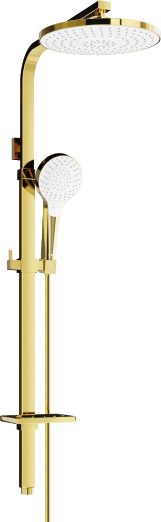 POZOR: lze použít jen pro speciální baterii s vrchním vývodem Technická data: Materiál sloupu: nerezová ocel, ABS Povrchová úprava sloupku: Zlato Výška: 930-1250 mm Šířka sloupku: 30 mm Vzdálenost od stěny: 385 mm Připojení: G 3/4 " Miska na mýdlo Posuvný držák sluchátka Nastavitelné montážní držáky Materiál dešťové sprchy: plast Dešťová sprcha: zlatá / bílá Velikost dešťové sprchy: ø225 mm Materiál sluchátek: plast Povrchová úprava sluchátek: zlatá / bílá Počet funkcí: 3 Materiál hadice: PVC Hadová úprava: zlato Délka hadice: 150 cm Mosazné hroty Hladký povrch usnadňuje udržování čistoty Otočné hroty zabraňují kroucení Pružný materiál odolný proti roztažení a ohnutí