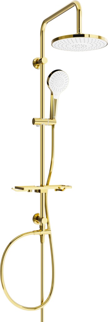 Technická data: Materiál sloupu: nerezová ocel, ABS Povrchová úprava sloupku: Zlato Výška: 950 mm Šířka sloupku: 22 mm Vzdálenost od stěny: 400 mm Miska na mýdlo Posuvný držák sluchátka Nastavitelné montážní držáky Materiál dešťové sprchy: plast Dešťová sprcha: zlatá / bílá Velikost dešťové sprchy: ø225 mm Materiál sluchátek: plast Povrchová úprava sluchátek: zlatá / bílá Počet funkcí: 3 Materiál hadice: PVC Hadová úprava: zlato Délka hadice: 150 cm Mosazné hroty Hladký povrch usnadňuje udržování čistoty Otočné hroty zabraňují kroucení Pružný materiál odolný proti roztažení a ohnutí