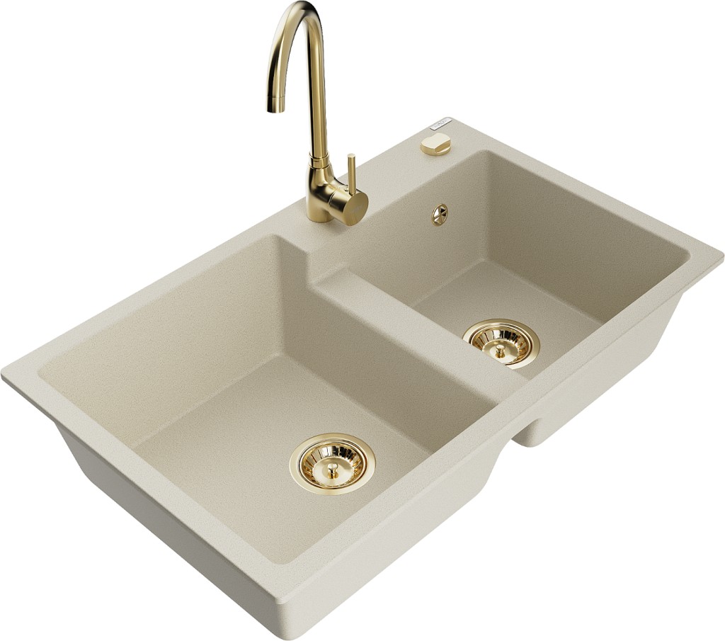Technická data: dřez: Rozměr: 800 x 500 x 190 mm Hloubka komory: 180 mm (větší), 180 mm (menší) Rozměry komory: 440x387 mm (větší), 370x303 mm (menší) Průměr odtoku: ø90 mm Typ: 2-komorový Typ: Zapuštěné do pracovní desky Barva béžová Povrchová úprava sifonu: zlatá Materiál: žula (80 % žulové kamenivo, 20 % pryskyřice) Přepadový otvor: Ano Otvory: (baterie, automatické) 2 Vysoká odolnost proti poškrábání a změně barvy Odolnost proti tepelným šokům Snadno čistitelný povrch Jeden dodatečný vyfrézovaný otvor pro samoděrování ø35 kuchyňská baterie: Materiál: mosaz Barva: Zlatá Hlava: Keramická Provzdušňovač: Ano Typ: Jedna páka Výška baterie: 335 mm Rozsah výtoku: 180 mm
