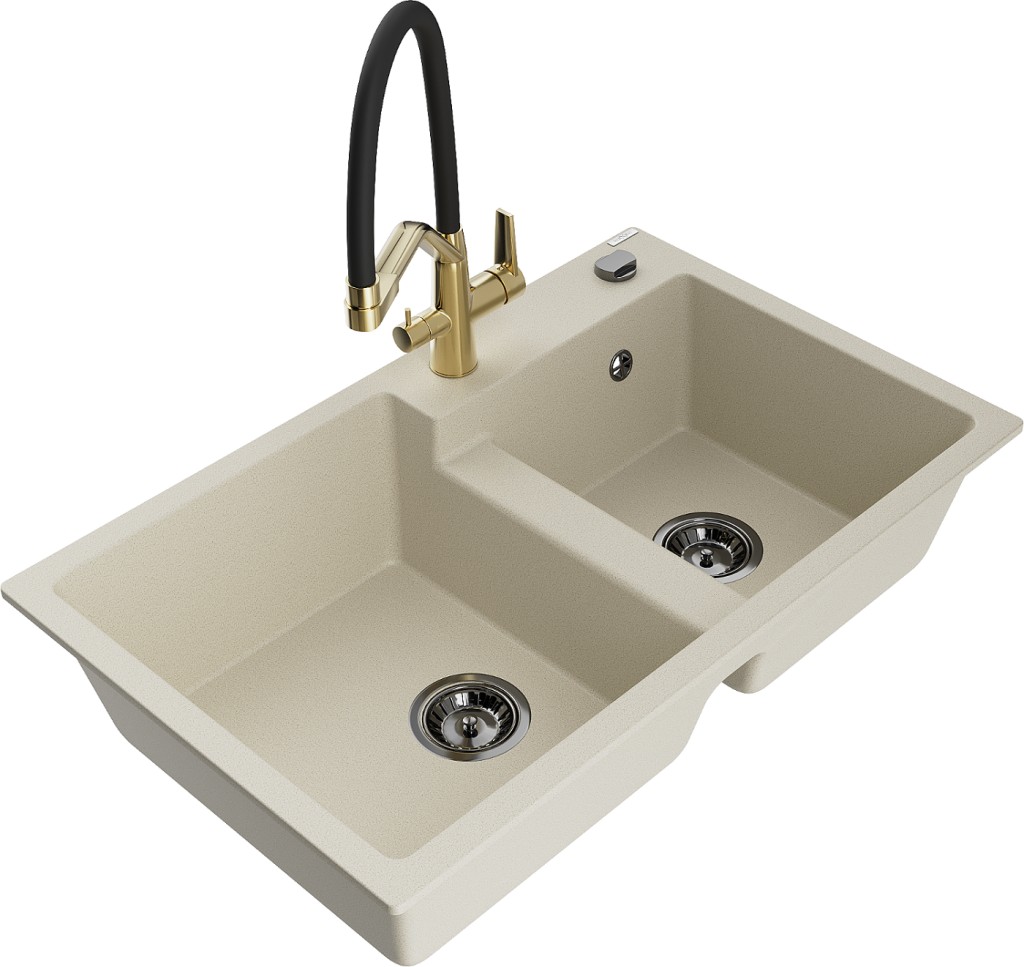 Technická data: dřez: Rozměr: 800 x 500 x 190 mm Hloubka komory: 180 mm (větší), 180 mm (menší) Rozměry komory: 440x387 mm (větší), 370x303 mm (menší) Průměr odtoku: ø90 mm Typ: 2-komorový Typ: Zapuštěné do pracovní desky Materiál: žula Barva béžová Povrchová úprava sifonu: černá Materiál: žula (80 % žulové kamenivo, 20 % pryskyřice) Přepadový otvor: Ano Otvory: (baterie, automatické) 2 Vysoká odolnost proti poškrábání a změně barvy Odolnost proti tepelným šokům Snadno čistitelný povrch Jeden dodatečný vyfrézovaný otvor pro samoděrování ø35 kuchyňská baterie: Materiál: mosaz Barva: Zlatá/Černá Hlavy: Keramické Provzdušňovač: Ano Typ hubice: Flexibilní s mosazným držákem Rozsah výtoku: 260 mm Výška: 405 mm Typ: Dvě rukojeti Dvouhlavá baterie s přídavným filtrem na pitnou vodu