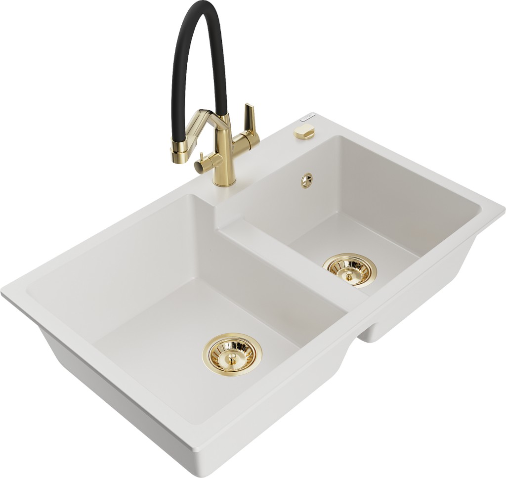 Technická data: dřez: Rozměr: 800 x 500 x 190 mm Hloubka komory: 180 mm (větší), 180 mm (menší) Rozměry komory: 440x387 mm (větší), 370x303 mm (menší) Průměr odtoku: ø90 mm Typ: 2-komorový Typ: Zapuštěné do pracovní desky Materiál: žula bílá barva Povrchová úprava sifonu: zlatá Materiál: žula (80 % žulové kamenivo, 20 % pryskyřice) Přepadový otvor: Ano Otvory: (baterie, automatické) 2 Vysoká odolnost proti poškrábání a změně barvy Odolnost proti tepelným šokům Snadno čistitelný povrch Jeden dodatečný vyfrézovaný otvor pro samoděrování ø35 kuchyňská baterie: Materiál: mosaz Barva: Zlatá/Černá Hlavy: Keramické Provzdušňovač: Ano Typ hubice: Flexibilní s mosazným držákem Rozsah výtoku: 260 mm Výška: 405 mm Typ: Dvě rukojeti Dvouhlavá baterie s přídavným filtrem na pitnou vodu