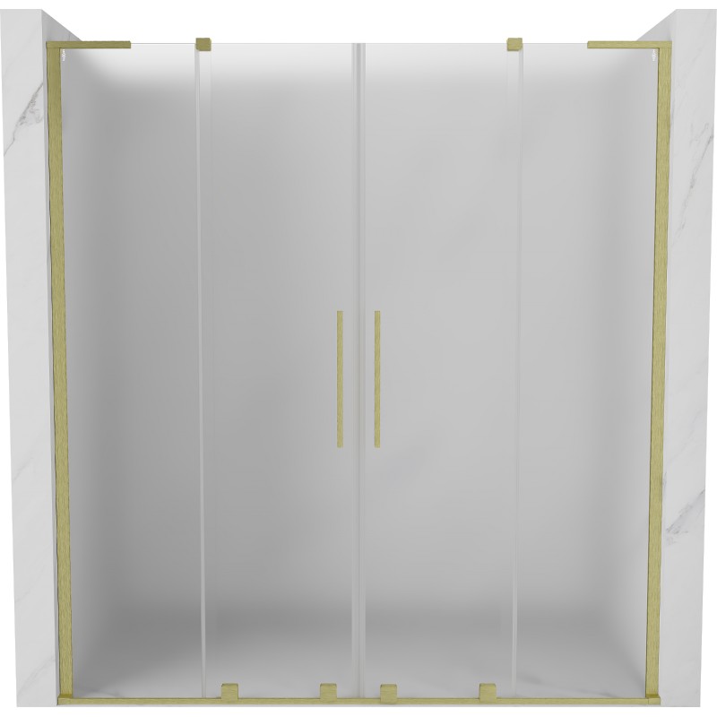 Specifikace produktu: Rozměr: 200x200 cm Instalace: Univerzální Vstup: posuvný Barva skla: Frost Typ skla: Tvrzené Tloušťka skla: 8 mm Profil: Hliník Povrchová úprava: broušené zlato L-úhlový stabilizátor: Nerezová ocel Povlak pro snadné čištění Vyrovnání nerovností stěny Nastavení šířky Lze namontovat na sprchovou vaničku nebo dlaždice Rukojeť z nerezové oceli Sada těsnění pro odvod vody Hliníkový těsnící práh dveří