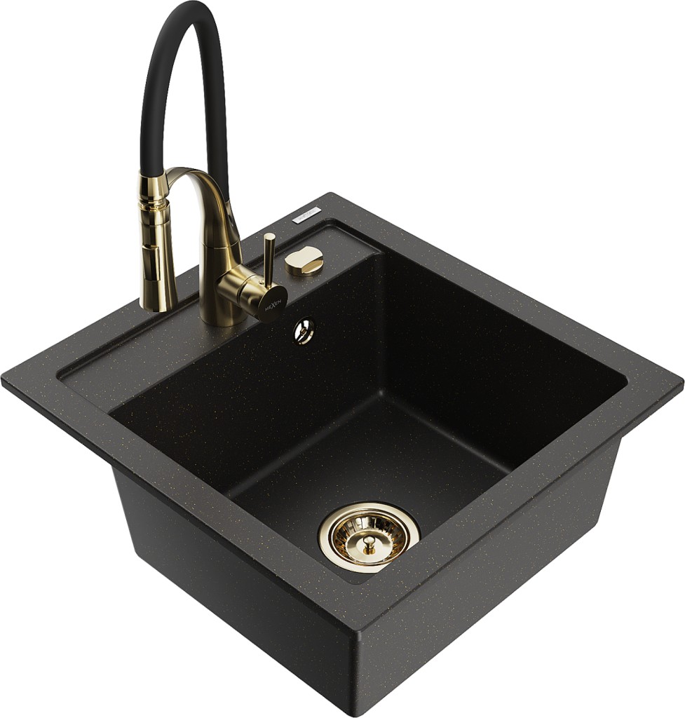 Technická data: dřez: Rozměr: 520 x 490 x 210 mm Hloubka komory: 200 mm Rozměry komory: 410x360 mm Průměr odtoku: ø90 mm Typ: 1-komorový Typ: Zapuštěné do pracovní desky Barva: černá/zlatá metalíza Povrchová úprava sifonu: zlatá Materiál: žula (80 % žulové kamenivo, 20 % pryskyřice) Přepadový otvor: Ano Otvory: (baterie, automatické) 2 Vysoká odolnost proti poškrábání a změně barvy Odolnost proti tepelným šokům Snadno čistitelný povrch Jeden dodatečný vyfrézovaný otvor pro samoděrování ø35 kuchyňská baterie: Materiál: mosaz Barva: Zlatá/Černá Hlava: Keramická Provzdušňovač: Ano Typ: Jedna páka Výška baterie: 430 mm Rozsah výtoku: 185 mm Baterie má výsuvný výtok