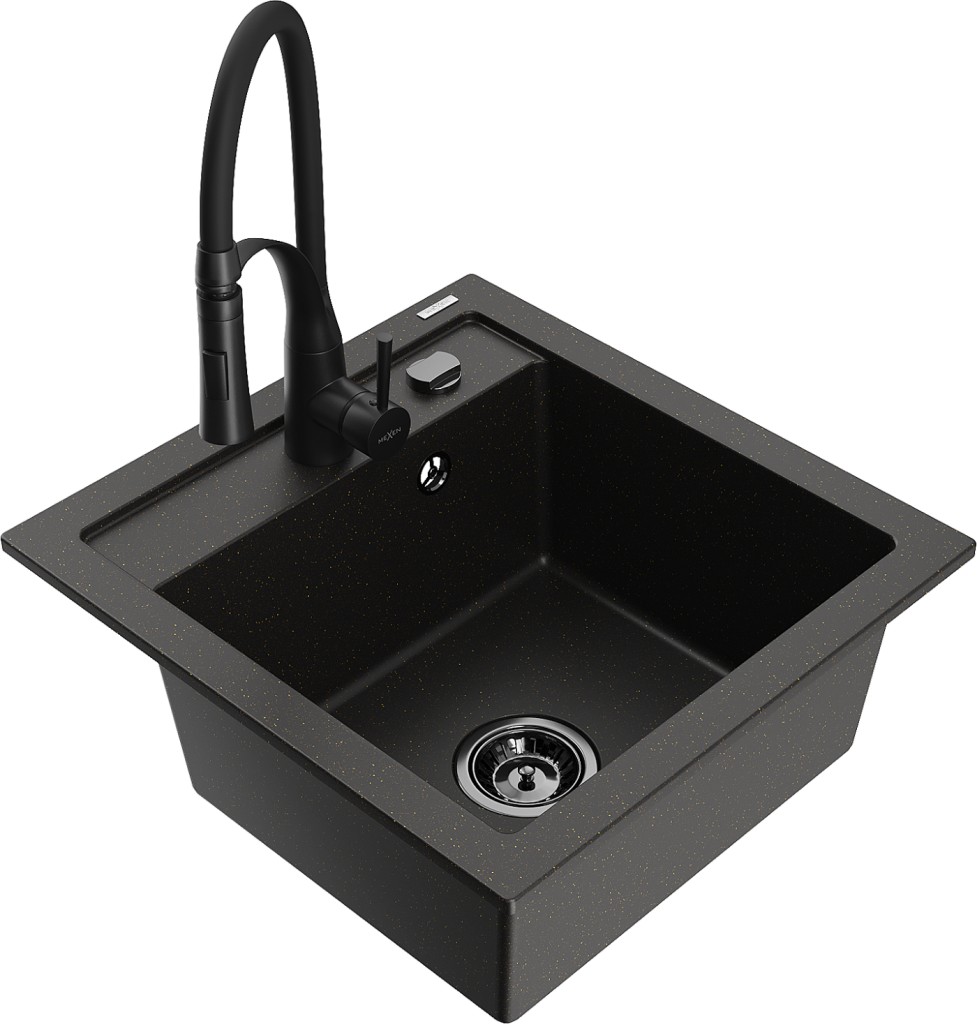 Technická data: dřez: Rozměr: 520 x 490 x 210 mm Hloubka komory: 200 mm Rozměry komory: 410x360 mm Průměr odtoku: ø90 mm Typ: 1-komorový Typ: Zapuštěné do pracovní desky Barva: černá/zlatá metalíza Povrchová úprava sifonu: černá Materiál: žula (80 % žulové kamenivo, 20 % pryskyřice) Přepadový otvor: Ano Otvory: (baterie, automatické) 2 Vysoká odolnost proti poškrábání a změně barvy Odolnost proti tepelným šokům Snadno čistitelný povrch Jeden dodatečný vyfrézovaný otvor pro samoděrování ø35 kuchyňská baterie: Materiál: mosaz Černá barva Hlava: Keramická Provzdušňovač: Ano Typ: Jedna páka Výška baterie: 430 mm Rozsah výtoku: 185 mm Baterie má výsuvný výtok