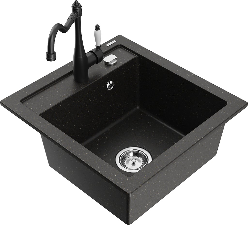 Technická data: dřez: Rozměr: 520 x 490 x 210 mm Hloubka komory: 200 mm Rozměry komory: 410x360 mm Průměr odtoku: ø90 mm Typ: 1-komorový Typ: Zapuštěné do pracovní desky Barva: černá/zlatá metalíza Povrchová úprava sifonu: Chrome Materiál: žula (80 % žulové kamenivo, 20 % pryskyřice) Přepadový otvor: Ano Otvory: (baterie, automatické) 2 Vysoká odolnost proti poškrábání a změně barvy Odolnost proti tepelným šokům Snadno čistitelný povrch Jeden dodatečný vyfrézovaný otvor pro samoděrování ø35 kuchyňská baterie: Materiál: mosaz Černá barva Hlava: Keramická Provzdušňovač: Ano Typ: Jedna páka Výška baterie: 290 mm Rozsah výtoku: 260 mm