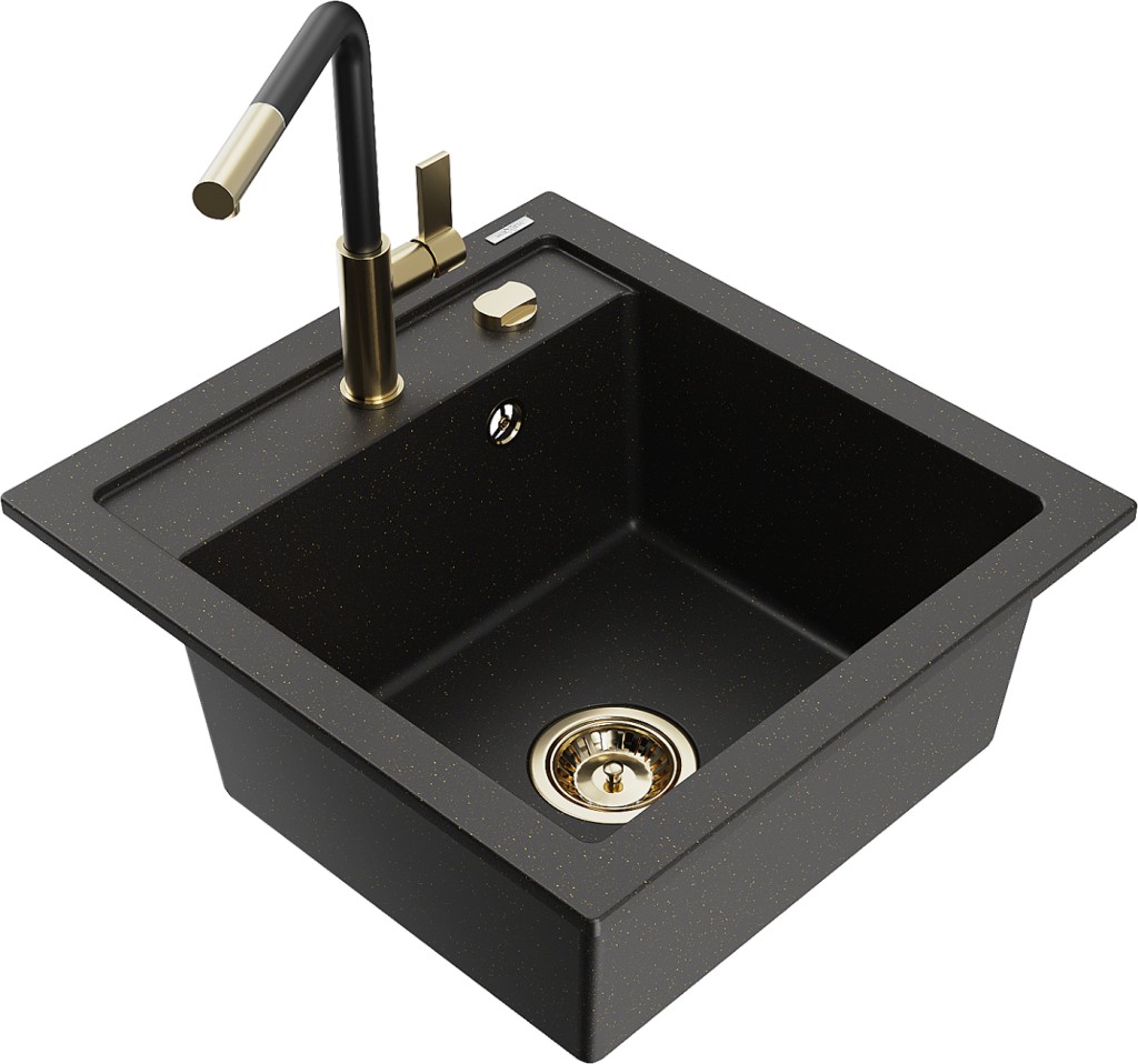 Technická data: dřez: Rozměr: 520 x 490 x 210 mm Hloubka komory: 200 mm Rozměry komory: 410x360 mm Průměr odtoku: ø90 mm Typ: 1-komorový Typ: Zapuštěné do pracovní desky Barva: černá/zlatá metalíza Povrchová úprava sifonu: zlatá Materiál: žula (80 % žulové kamenivo, 20 % pryskyřice) Přepadový otvor: Ano Otvory: (baterie, automatické) 2 Vysoká odolnost proti poškrábání a změně barvy Odolnost proti tepelným šokům Snadno čistitelný povrch Jeden dodatečný vyfrézovaný otvor pro samoděrování ø35 kuchyňská baterie: Materiál: mosaz Barva: Zlatá/Černá Hlava: Keramická Provzdušňovač: Ano Typ: Jedna páka Rozsah výtoku: 245 mm Výška baterie: 307 mm