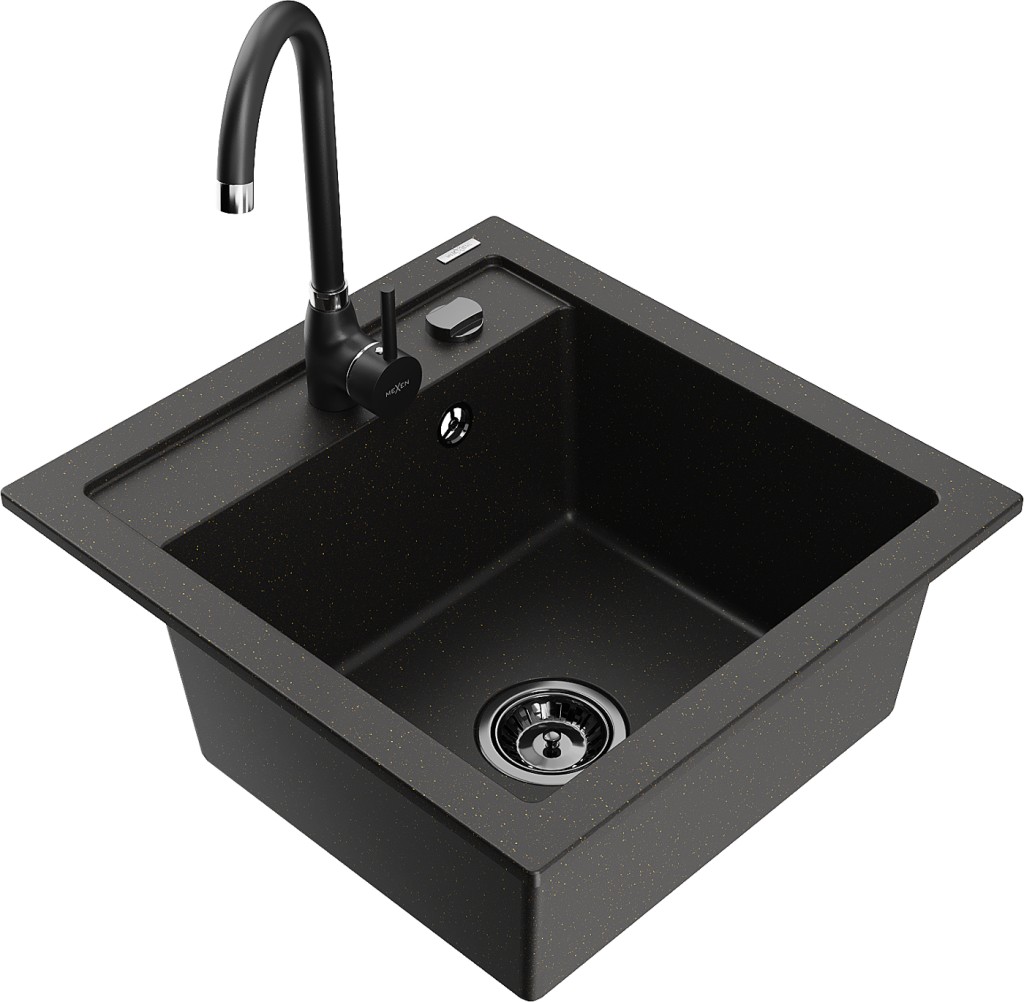 Technická data: dřez: Rozměr: 520 x 490 x 210 mm Hloubka komory: 200 mm Rozměry komory: 410x360 mm Průměr odtoku: ø90 mm Typ: 1-komorový Typ: Zapuštěné do pracovní desky Barva: černá/zlatá metalíza Povrchová úprava sifonu: černá Materiál: žula (80 % žulové kamenivo, 20 % pryskyřice) Přepadový otvor: Ano Otvory: (baterie, automatické) 2 Vysoká odolnost proti poškrábání a změně barvy Odolnost proti tepelným šokům Snadno čistitelný povrch Jeden dodatečný vyfrézovaný otvor pro samoděrování ø35 kuchyňská baterie: Materiál: mosaz Černá barva Hlava: Keramická Provzdušňovač: Ano Typ: Jedna páka Výška baterie: 335 mm Rozsah výtoku: 180 mm