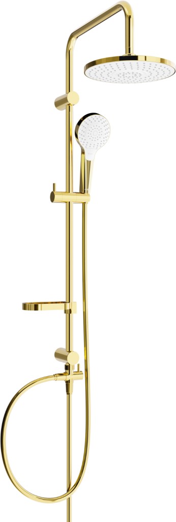 Technická data: Materiál sloupu: nerezová ocel, ABS Povrchová úprava sloupku: Zlato Výška: 950 mm Šířka sloupku: 22 mm Vzdálenost od stěny: 400 mm Miska na mýdlo Posuvný držák sluchátka Nastavitelné montážní držáky Materiál dešťové sprchy: plast Dešťová sprcha: zlatá / bílá Velikost dešťové sprchy: ø225 mm Materiál sluchátek: plast Povrchová úprava sluchátek: zlatá / bílá Počet funkcí: 3 Materiál hadice: PVC Hadová úprava: zlato Délka hadice: 150 cm Mosazné hroty Hladký povrch usnadňuje udržování čistoty Otočné hroty zabraňují kroucení Pružný materiál odolný proti roztažení a ohnutí