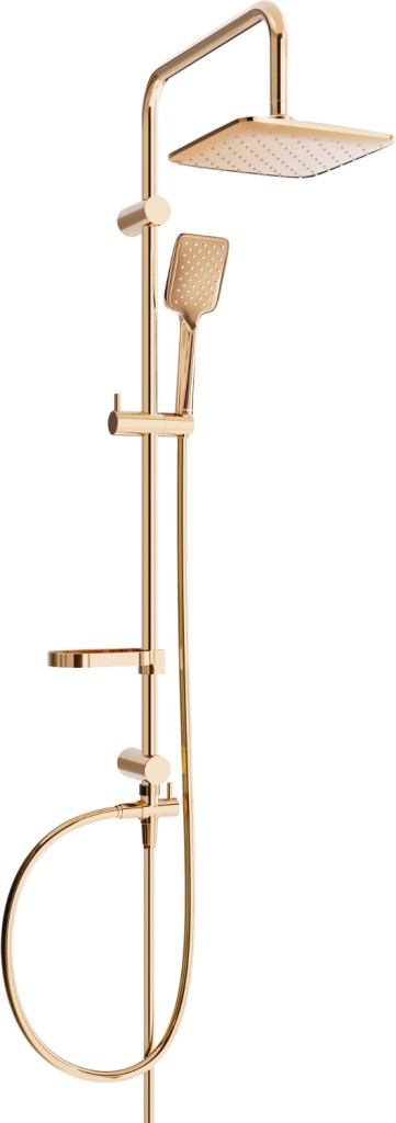 Technická data: Materiál sloupu: nerezová ocel, ABS Povrchová úprava sloupku: Růžové zlato Výška: 950 mm Šířka sloupku: 22 mm Vzdálenost od stěny: 400 mm Miska na mýdlo Posuvný držák sluchátka Nastavitelné montážní držáky Materiál dešťové sprchy: plast Povrchová úprava deště: Růžové zlato Velikost dešťové sprchy: 200x200 mm Materiál sluchátek: plast Povrchová úprava sluchátek: růžové zlato Počet funkcí: 1 Materiál hadice: PVC Hadová úprava: Růžové zlato Délka hadice: 150 cm Mosazné hroty Hladký povrch usnadňuje udržování čistoty Otočné hroty zabraňují kroucení Pružný materiál odolný proti roztažení a ohnutí