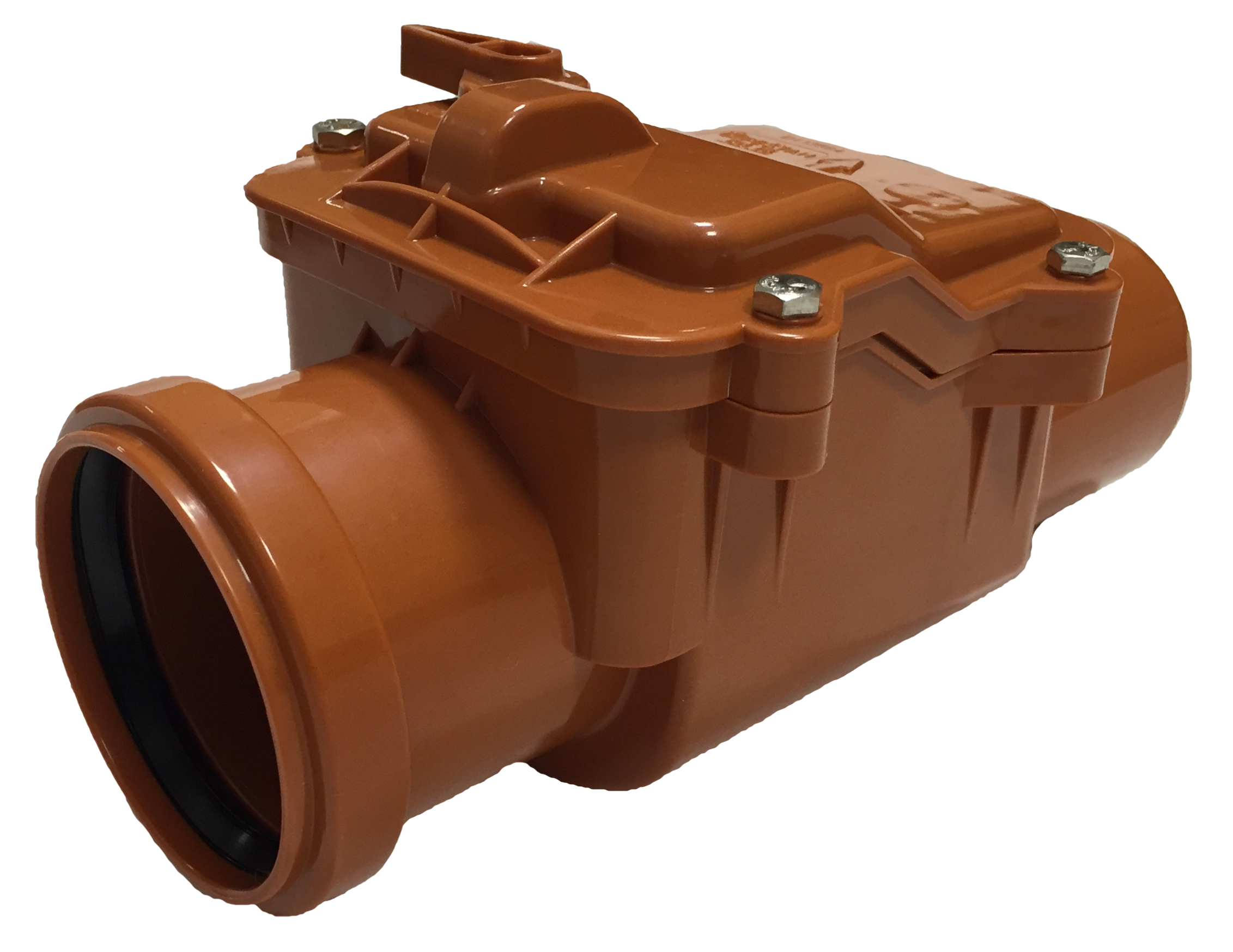 Zpětná klapka HT - oranžová - pro instalaci ve vodorovném směru Ochrana během přívalových dešťů. Jednouzávěrový systém zabraňuje zpětným průtokům. Je určen k odtoku běžné komunální vody Zpětný blok - uzavíraný ručně - bez bez příplatku ve zpětné klapce - zvlášť vhodný během delší dovolené nebo rekonstrukce . Materiál ABS / PVC
