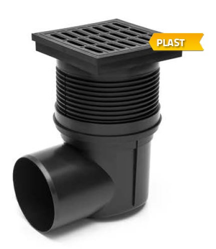 Kanalizační vpusť boční D110 s nerezovou/plastovou/litinovou mřížkou , obsahuje vodní protizápachovou hladinu a používá se pro venkovní montáž.