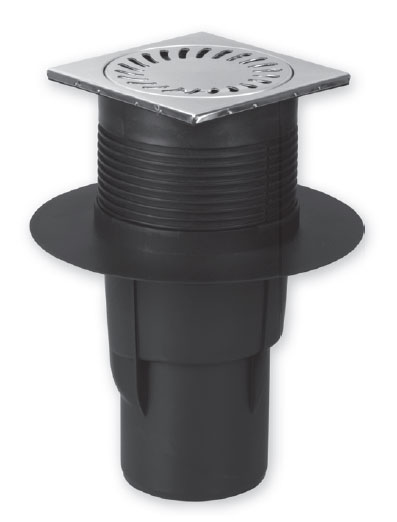 Kanalizační vpusť 15x15 cm ,se spodním vývodem D110, obsahuje protizápachovou klapku a límec pro napojení hydroizolace k tělesu kanalizační vpusti. Odolnost do 90°C . Zatížení 300 kg Pro venkovní i vnitřní použití