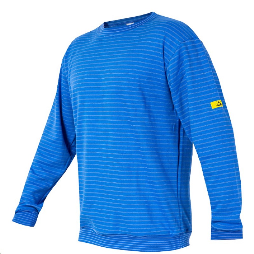 ESD mikina - ESD pohodlná mikina s dlouhým rukávem z bavlněného úpletu. - Antistatické vlastnosti zajišťuje vetkané uhlíkové vlákno. - Průkrčník ve tvaru U. - Znak ESD na spodním lemu. 96%ba+4%uhlík 280g pružné úplety na rukávech a spodním dílu EN 1149-1 velikosti XS-XXXL barvy modrá, bílá , černá požadovanou barvu a velikost uveďte do poznámky