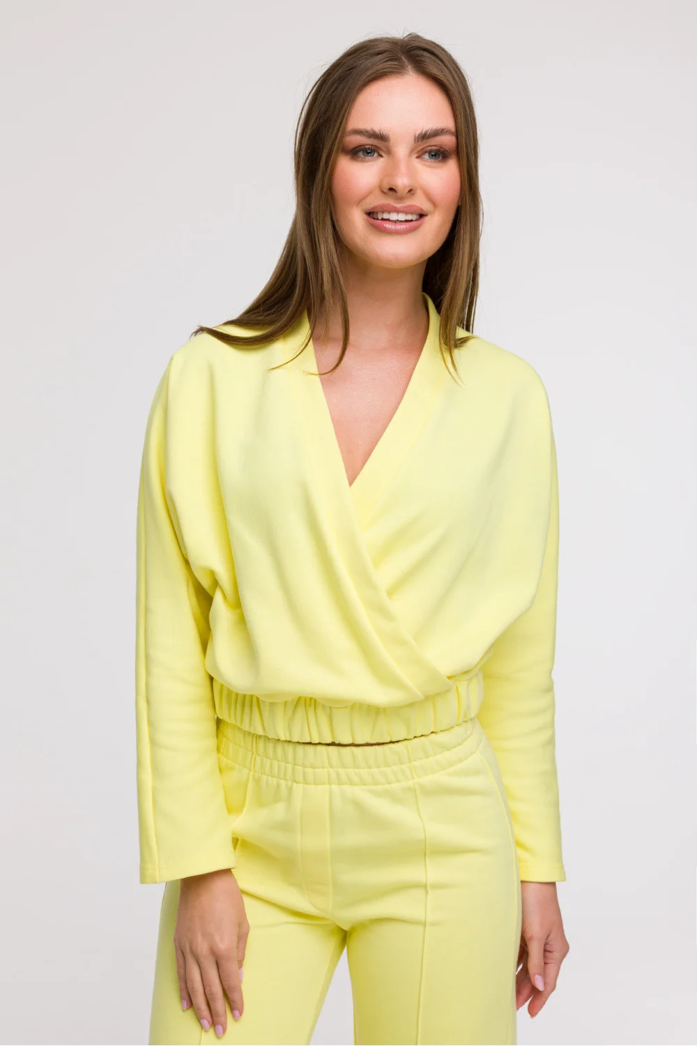 Tato dámská blůza ve stylu s překlopeným límcem je kombinací pohodlí a elegance, která se skvěle hodí jak na každý den, tak i na dovolenou. Vyšita v Polsku s důrazem na detaily, vyniká předním překlopením ve tvaru písmene V, které jemně zdůrazňuje výstřih a dodává lehkost celé postavě. Střih je volný v ramenou a hrudníku, díky elastickému pasu v pase se blůza harmonicky přizpůsobuje tělu, zdůrazňujíc ženské tvary. Tento střih způsobuje, že model vypadá zejména dobře na postavách typu hruška, vyvažující poměr mezi horní a dolní částí těla. Délka po pas a dlouhé rukávy ji činí funkční a snadno se stylizují, jak v casualové, tak elegantní verzi. Bavlna 90 % Polyester 10 % Velikost Celková délka Obvod prsou L57 cm126 cmM55.5 cm121 cmS54 cm116 cmXL58.5 cm131 cm