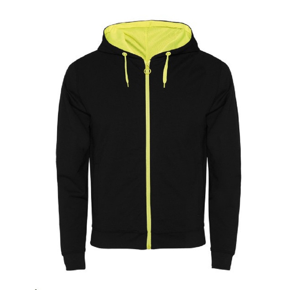 Mikina pánská s kapucí a dlouhým zipem Fuji Pánská mikina s fluorescenčními díly. Celopropínací zip s fluorescenčním běžcem. Kapuce podšitá mikro-perforovanou tkaninou, se šnůrkou a kovovými očky ve fluorescenční barvě. 1x1 žebrování na rukávech a lemu. Dvě přední kapsy. Zpevněné skryté švy na průkrčníku. Úplet: hladký úplet Materiál: 85% bavlna / 15% viskóza Gramáž: 280 g/m2 Barva světlý melír/svítivě oranžová,šedý melír/svítivě žlutá,černá/svítivě oranžová,černá/svítivě žlutá Velikost - S,M,L,XL,XXL