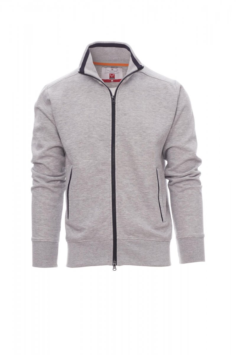 • Mikina se skrytým dvoucestným plným plastovým zipem s kovovým stahovačem, kontrastními ozdobami na manžetách a límci. Dvě boční kapsy se zipem, manžetami a pasem v roztaženém žebru; dvojité prošití na límci, rukávy a pasu a vyztužovací pásky na límci.