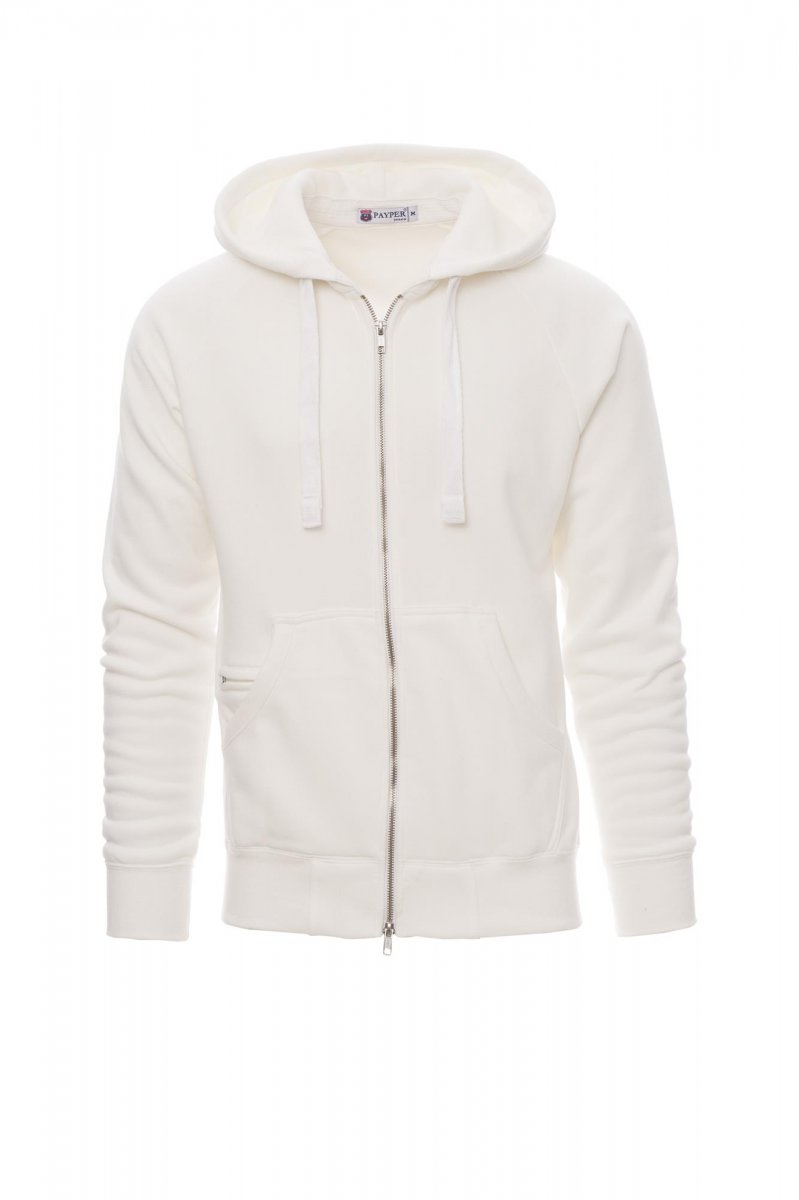 - Pánská mikina s celoplošným dvojitým kovovým zipem s kapucí a šňůrkou s kovovými kroužky a bílou nití s kontrastním prošíváním, klokankovými kapsami s žebrem, malým kapsičkem s bezpečném zipem, protaženými manžetami a pasem. Bílý efekt mélange (černý pro Bordeaux).