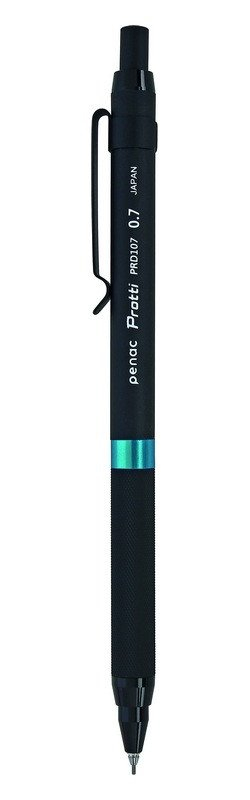 Dárková mikrotužka Penac Protti s kovovou objímkou pro přesné linky při rýsování, šrafování, skicování, psaní i kreslení. Elegantní štíhlé kovové tělo v matné černé barvě, jehož jednoduchý design doplňují decentní kovové prvky a lesklý tyrkysový proužek. Unikátní měkký mechanismus zabraňuje zlomení tuhy a zajišťuje pohodlné psaní. Udrží i velmi krátké tuhy, čímž umožňuje využít tuhu na maximum. Protiskluzový úchop ve formě vroubkování, kovový klip, pryž bez silikonu a PVC. Dodáváno v papírové dárkové krabičce. Šíře: 0,7 mm. Vyrobeno v Japonsku.