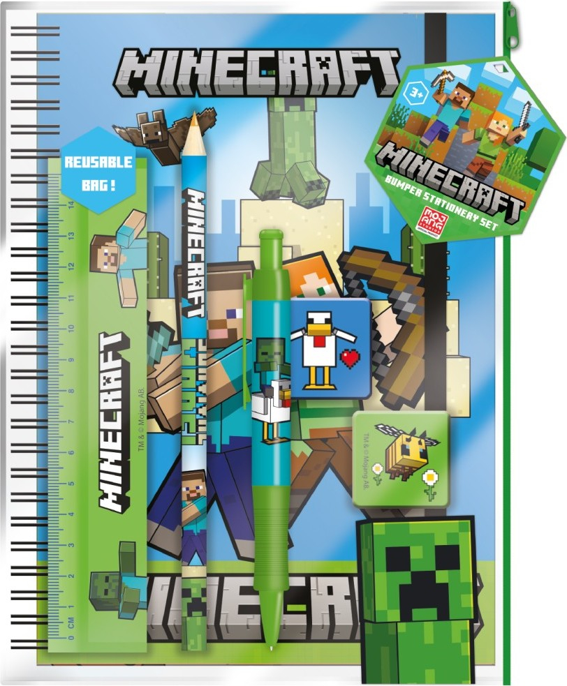 Školní set v praktickém plastovém uzavíratelném obalu Minecraft. Set obsahuje kroužkový blok A5, pero, tužku, pravítko, gumu a ořezávátko .