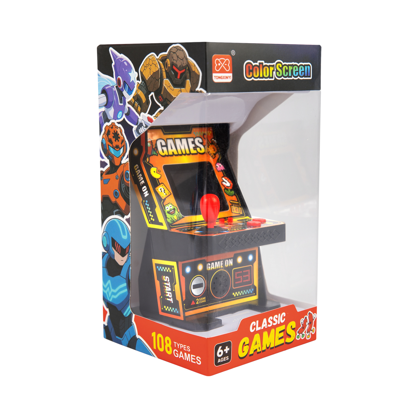 Mini arkádovka v klasickém designu s barevnou obrazovkou přináší 108 arkádových her inspirovaných legendárními tituly. Hra funguje na 3 AAA baterie, které nejsou součástí balení.