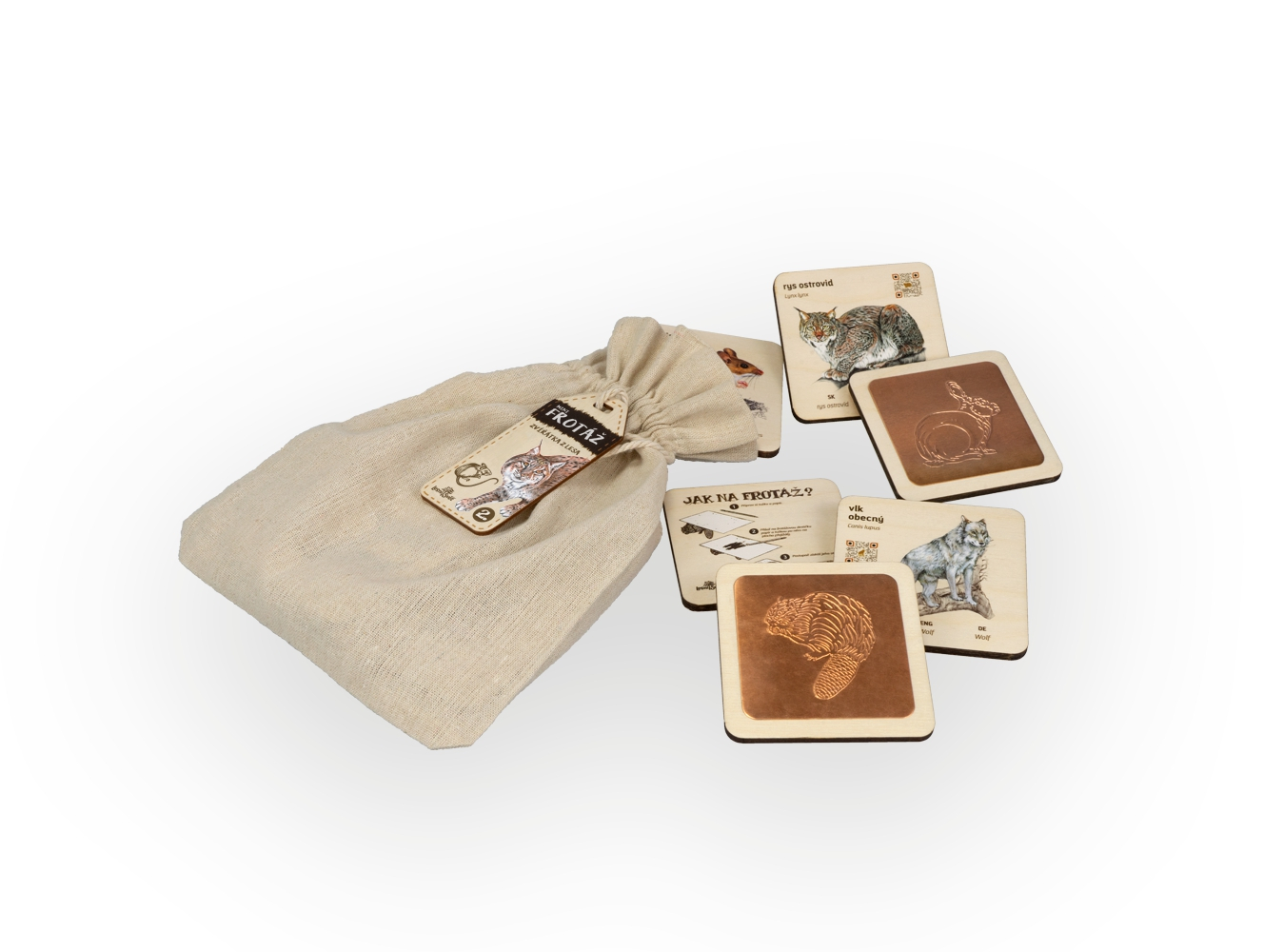 Kreativní a nápadité tvoření Frotáž je výtvarná technika, při níž se struktura nebo textura předmětu přenáší třením přes papír. Obvykle se k frotážování používá tužka, pastel, uhly nebo voskovky. Fotážování se skvěle kombinuje s dalšími výtvarnými a výukovými aktivitami. Rozvíjí smyslové vnímání, motoriku i kreativitu. Hravou formou seznamuje děti i dospělé s přírodou. Obsahuje český a latinský název Dále názvy ve slovenštině, němčině a angličtině. Frotážová sada je komplexní učební pomůcka určena pro vnitřní i venkovní výuku. Vhodná pro výuku cizích jazyků. Využívá QR kódy, které obsahují hlasy zvířat, básničky a další zajímavosti. Naše frotáže nesou ochranu průmyslového vzoru EUIPO. Frotáže z Lesního světa Balení obsahuje 10 dřevěných frotážových destiček. Dřevěnou destičku s návodem na frotážování. Rozměr destičky je 9x9 cm. Dodáváno s měděno-zinkovými nebo hliníkovými frotážovými destičkami. Součástí destiček jsou QR kódy. Zabaleno v přírodním látkovém pytlíku. České výrobky z Hradce Králové. Originální obrázky od českých ilustrátorů. Druhy zvířat: medvěd hnědý, rys ostrovid, vlk obecný, netopýr ušatý, myšice lesní, králík divoký, vydra říční, bobr evropský, muflon evropský, los evropský Jirka Novák, malíř a ilustrátor Tvoří převážně realistické kresby fauny a flóry. Ilustrátor učebních pomůcek, naučných tabulí a her s tématikou českých živočichů. Více o Jirkovi Jak na frotážování 1. Připravte si vše potřebné Budete potřebovat frotážovou destičku, čistý papír a měkkou tužku (ideálně grafitovou, alespoň HB nebo měkčí). 2. Umístěte destičku pod papír Frotážovou destičku umístěte tak, aby motiv byl v místě, kde ho chcete vykreslit. Ujistěte se, že se papír nepohybuje – můžete ho lehce přidržet rukou nebo přichytit páskou. 3. Začněte přejíždět tužkou Vezměte tužku do ruky pod mírným úhlem (šikmo) a jemně přejížděj po papíru. Nezajíždějte moc na jedno místo, spíš rovnoměrně klouzejte. 4. Dokončete obrázek Když máte celý motiv vykreslený, můžete ho ještě dozdobit, domalovat nebo zkusit jinou barvu. Každá frotáž je originál! Může se hodit Papírové bloky Nemáte po ruce prázdný papír na frotážování? Naše bloky jsou z ekologického papíru a navíc s krásnými ilustracemi. Dostupné ve velikostech A4, A5 i A6. Papírové bloky Dřevěná razítka Oblíbený doplňková, nebo navazujícíc aktivita k fotážování. Děti milují svět fantazie. S razítky snadno dotvoříte příběh na papíru i mimo něj. Razítka VšudyLEPKY Neobyčejné originální samolepky s motivy zvířat snadno doplní frotáže o nový prvek. VšudyLEPKU můžete opakovaně přemisťovat. VšudyLEPKY Aplikace Lesní svět Naučná aplikace zdarma ke stažení Destičky obsahují QR kódy Po načtení můžete přehrát zvuk zvířete Součástí je animace a krátké povídání Vyzkoušejte, co všechno umí * Aplikaci stahujte pouze z oficiálních obchodů Google Play nebo AppStore, kde je ověřená a dostupná vždy zdarma. Od jakékoliv jiné aplikace se Lesní svět distancuje a nenese žádnou zodpovědnost za její použití.