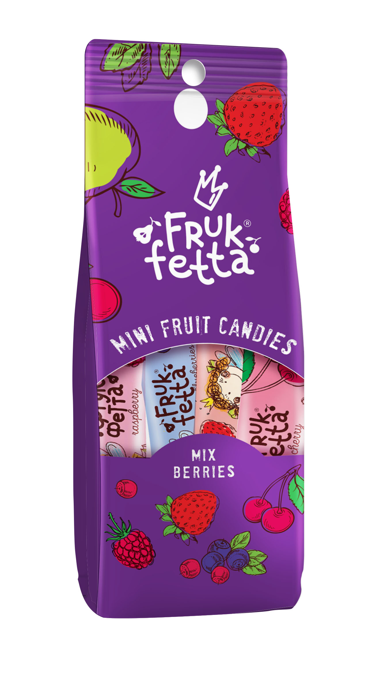 Ovocný snack Frukfetta MIX BERRIES 120g směs bobulovitých mini ovocných tyčinek Třešeň, malina, jahoda, brusinka-borůvka.Mini bonbóny jsou s velkým podílem čistého ovoce a se sníženým obsahem cukru. Ovocná tyčinka pro zdravé a lehké mlsání během dne.Při výrobě se nepoužívají žádné chemické přísady pro zachování barvy a vzhledu. Složení:TŘEŠEŇ - třešeň (42,6 %), jablko (47,9 %), řepný cukr (9,5 %)MALINA - malina (49,1 %), jablko (41,4 %), řepný cukr (9,5 %)JAHODA - jahoda (45,8 %), jablko (45,2 %), řepný cukr (9,0 %)BRUSINKA/BORŮVKA - brusinka (24,5 %), borůvka (13,4 %), jablko (53 %), řepný cukr (9,1 %) Výživové údaje (výživová hodnota) na 100 g výrobku: Tuk - 0,72 g (z toho nasycené tuky - 0,0 g)Sacharidy - 70,15 g, (z toho cukr - 47,73 g)Bílkoviny - 2,37 gVláknina - 1,9 gSůl - 0 g Při výrobě směsi se nepoužívají žádné chemické přísady, příchutě a látky zvýrazňující chuť.