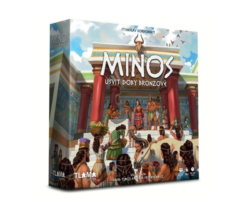 Ve starověké krétské říši, na sluncem zalitých plážích a ve spletitých chodbách Knóssu, se právě rozhoduje o osudu mínojské civilizace. Jako vůdce jednoho ze čtyř proslulých mínojských klanů vás čeká dosud největší životní zkouška: musíte usiloval o prestižní titul Mínoa, nejvyššího vládce tohoto lidu. Ale pamatujte – na rozdíl od bouřlivých válečných tažení jiných civilizací jsou Mínoané známí především snahou o mír a blahobyt. A právě v tomto duchu se ponese vaše cesta k trůnu. Vaším cílem je vyhnout se střetu čepelí a zápolit pouze na poli vlády a budování jedinečné identity klanu. Jako vůdci minojských klanů mají hráči na svých bedrech rozvoj první evropské civilizace. Budujte města, památky a další stavby, otevírejte nové obchodní cesty, expandujte a předčete nepřátelské kmeny, plánujte své akce s klanovou radou, provádějte výzkum a vydávejte výnosy, aby vaše další akce byly mocnější vašich protivníků! Máte pouze 4 kola na to, abyste dokázali, že jste hodni věhlasného titulu Minos. Vyberte a přiřaďte kostky na akční políčka. S kostkami nižší hodnoty si můžete zajistit silnější akce, ale kostky s vyšší hodnotou vám pomohou stoupat na stupnicích pokroku a získávat další výhody. Během fáze akcí každý hráč sbírá své kostky v pořadí od nejvyšší po nejnižší a provádí předem naplánované akce. Hráči také vykládají karty rozvoje, které pak mohou přesunout do svého paláce a učinit z nich výnosy. Každá karta rozvoje má okamžitý efekt a také odměnu, kterou získáte vždy při splnění podmínky, když se později stane karta výnosem. Navíc dvakrát za hru hráči získají vítězné body za svůj civilizační pokrok v oblastech. Titul Mínoa čeká jen na vás! Dokažte, že jste nejvhodnějším kandidátem na vládce této starověké civilizace. Pečlivě naplánujte akce, postupujte po stupnicích pokroku, zlepšujte své akce, bojujte s tajemnými mořskými národy, navazujte námořní obchodní styky a stavějte města, která přetrvají celá tisíciletí. Obstojíte v této výzvě? Hra je určena pro 1-4 hráče od 14 let. Pravidla a nápovědy hráčů jsou v češtině. Herní materiál je jazykově nezávislý. Obsah balení: 1 oboustranný herní plán 5 překryvných akčních desek 1 překryvná deska mapy 1 žeton začínajícího hráče 1 ukazatel kol 4 dvouvrstvé desky hráčů 144 karet výnosů 9 počátečních karet 3 oboustranné desky obchodních cest 30 destiček obchodních bonusů 20 destiček založení města 12 destiček váz 54 destiček zboží 54 destiček dočasného zboží 20 destiček mořských národů 5 desek zvláštních schopností 5 destiček akčních bonusů 74 mincí 74 žetonů zbraní 4 žetony +100/+200 VB 17 kostek 8 nápověd hráčů 12 měst 12 věží 12 lodí 16 statků 40 válečníků 16 držáků kostek 36 ukazatelů 20 karet pro sólovou hru 1 nápověda pro sólovou hru 1 pravidla 1 sólová pravidla