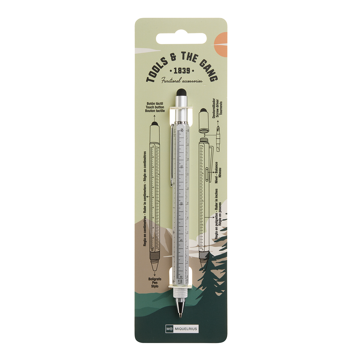 rozměry pera: 155 × Ø 13 mmbarva náplně: modrástiskací mechanika5 v 1: kuličkové pero, pravítko v centimetrech i palcích, vodováha, plochý a křížový šroubovák, dotykový stylus pro tablety a smartphonybarva: stříbrnáobsah balení: 1 ks