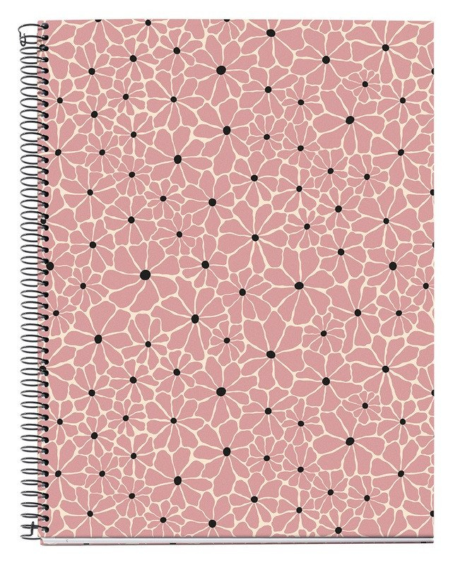 Kroužkový blok v kartonových deskách, potažený matným tištěným papírem. Výrazný motiv květin, kontrastní černá spirála. • obálka: karton s matným povrchem a ochrannou plastovou vrstvou • formát: A4, 100 listů, linkovaný, 70 g/m2 • černá kroužková vazba pro pohodlné 360° listování • mikroperforace a děrování • zvýrazněné záhlaví, strany v 4 barvách • certifikát FSC • vyrobeno ve Španělsku