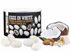 Andělsky bílá, nebesky dobrá! Splnili jsme přání milovníků kokosových vajíček a naplnili jimi celý tubus! Vychutnejte si pražené mandličky v bílé čokoládě posypané strouhaným kokosem. chuťový zážitek nabízíme opět bez palmového oleje a umělých aromat