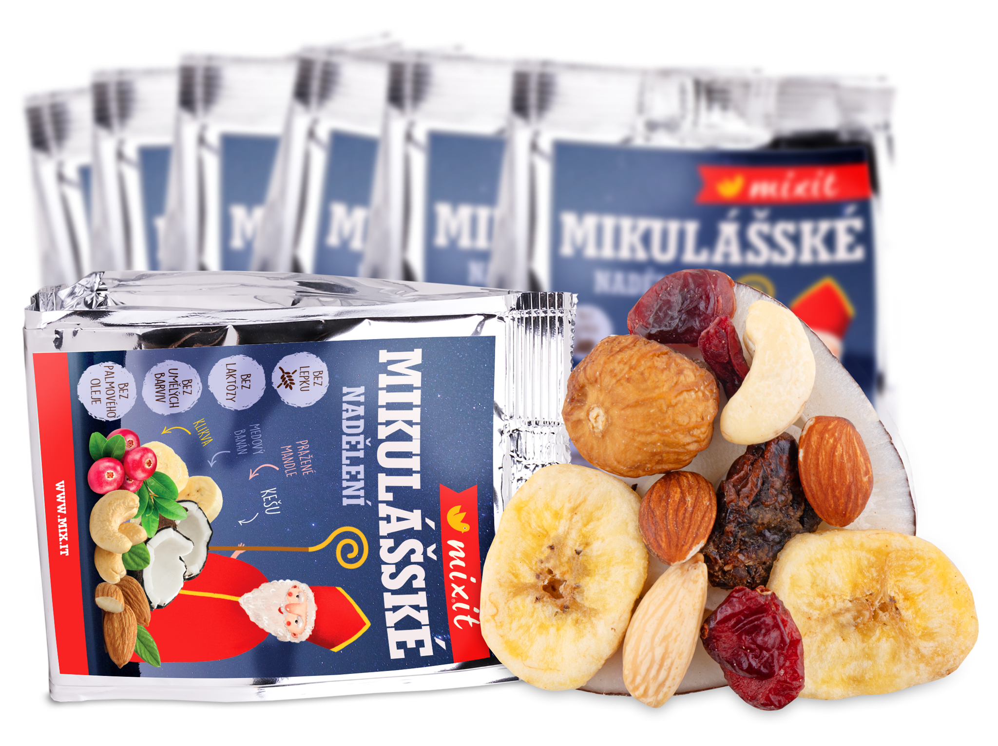 Mik, miku, Mikulášské nadělení do kapsy! Pro všechny hodné děti jsme namixovali ořechy, kokos, brusinky, mini fíky, medový banán a další zdravé zobání. Tahle nadílka se vejde do kapsy a je bez lepku, umělých barviv a palmového oleje. Mikuláš bude mít co dělat, aby vyladěnou směs ořechů a ovoce nesnědl dětem cestou. :-) limitovaná edice zdravá nadílka plná bílkovin a vlákniny neobsahuje palmový olej, umělá barviva ani uhlí :-) Složení Směs sušeného ovoce a ořechů klikva 17 % (klikva "brusinka kanadská" 65 %, cukr, slunečnicový olej), jádra kešu ořechů 15 %, sušené fíky 14 % (fíky 97 %, rýžová mouka), mandle loupané pražené 12 %, sušené datle 12 %, pražené mandle 12 %, kokosové plátky 10 %, medový banán 8 % (banán 70 %, cukr 17 %, kokosový olej, med 2 %, banánové aroma)Může obsahovat stopy lepku, mléka, jiných skořápkových plodů, arašídů, sezamu, sóji a části skořápek a pecek. Výživové údaje na 100 g Energetická hodnota 1890.0 kJ / 451.51 kcal Tuky 29.0 g z toho nasycené mastné kyseliny 10.0 g Sacharidy 48.0 g z toho cukry 31.0 g Vláknina 6.1 g Bílkoviny 9.8 g Sůl 0.02 g
