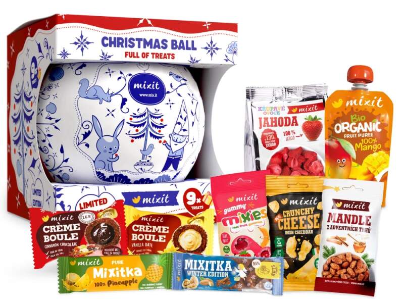 Vánoční koule plná dobrot není jen nejoriginálnější ozdoba na stromeček – je to poklad plný nejoblíbenějších Mixit dobrot! Uvnitř najdete křupavý irský cheddar, 100% mangovou BIO kapsičku, Křupavou jahodu a další bestsellery. Každá koule obsahuje celkem 9 pečlivě vybraných dobrot tak, aby potěšila malé i velké mlsouny. Ideální jako vánoční dárek nebo jako společné mlsání dobrot během adventu. Nejoriginálnější vánoční ozdoba Obsahuje 9 pečlivě vybraných dobrot Složení 1x Křupavý sýr do kapsy – Irský cheddar1x Mixit BIO ovocná kapsička – 100% Mango1x Křupavé ovoce do kapsy – Jahoda1x Crème boule – Cinnamon Chocolate1x Crème boule – Vanilla Date1x Ovocné Mixies - Jahoda & banán – přírodní želé bonbóny1x Mixitka – Vánoční1x Ovocná Mixitka – 100% Ananas1x Mandle z adventních trhů