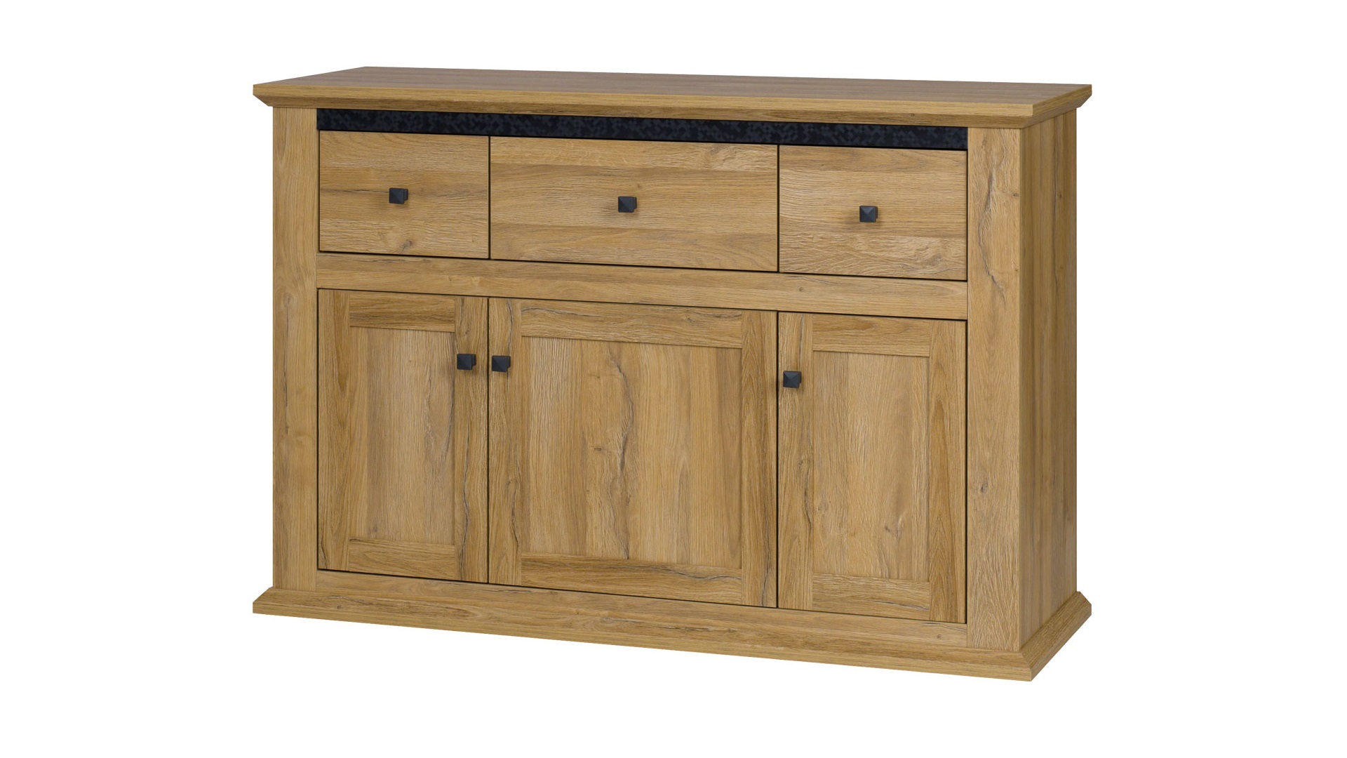 Komoda Mezo MZ13 • Vlastnosti: Materiál Komponenty ze sestavy Mezo jsou vyrobeny z laminované dřevotřískové desky.  Hrany desek Hrany desek jsou opatřeny ABS dýhou. Úchyty Dvířka/zásuvky otevřete pomoví kovových úchytek. • Barevné provedení Komponenty ze sestavy Mezo jsou dodávány v odstínu Dub grand nebo v kombinaci Dub grand a Bílá alpská. Dub grand Dub grand / Bílá alpská • Rozměry  87 cm celková výška 130 cm  celková šířka 45 cm celková hloubka 16 mm tloušťka desky • Sestava MezoZaujal vás daný kus a rádi byste si pořídili další díly ze sestavy Mezo? Šatní skříň, komoda, konferenční stolek, vitrína a další. Vytvořte si sestavu podle svých představ. Zobrazit více • UpozorněníOdstíny prezentované na fotografiích jsou ilustračním materiálem, barvy se mohou lišit od vyobrazení na fotografiích podle nastavení vašeho zobrazovacího zařízení.