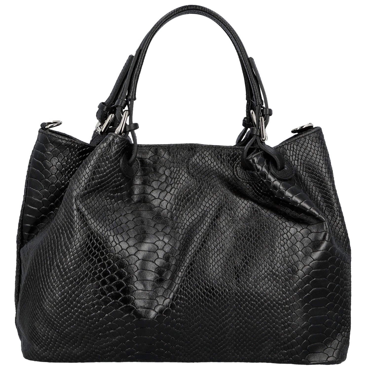 Tento kousek je výjimečný svým designem i tvarem. Její hlavní kapsu zajistíte zipem. Interiér je dělený středovou zipovou kapsou a menší kapsičky v podšívce zajistí správné uspořádání vašich věcí. Pevná kožená ucha vám skvěle padnou do ruky a zdobí je stříbrné přezky.