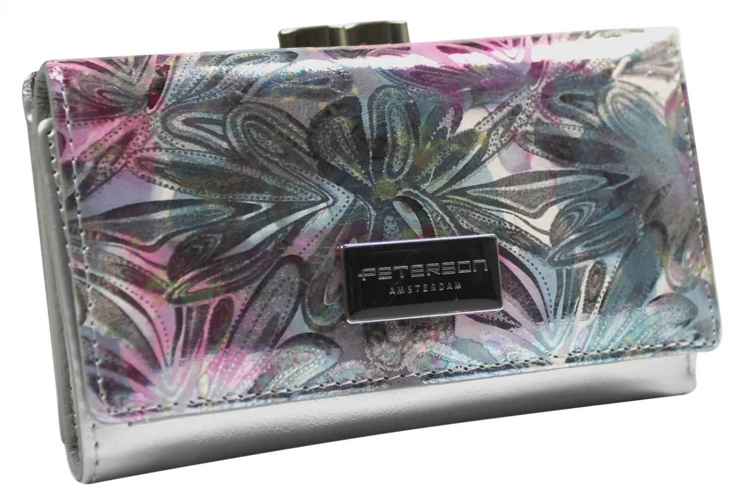 Přední stranu zdobí výrazný vzor s barevnými květy a elegantní kovové logo značky. Peněženka se otevírá na druk, uvnitř nabízí praktické přihrádky na karty a papírové peníze. Druhá část je vyhrazena pro mince, uzavírá se kovovým rámečkem se zlatým kováním.