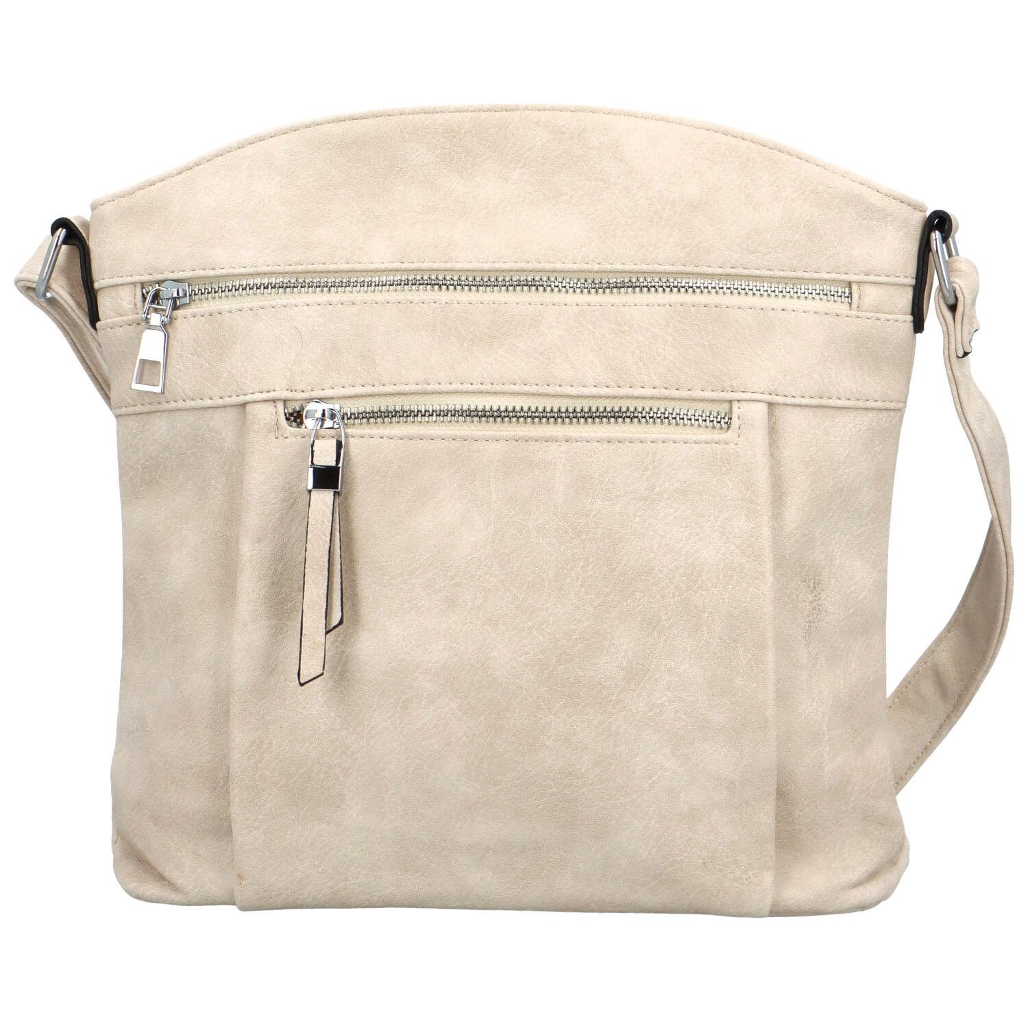 Kabelka má hlavní kapsu na zip a uvnitř středovou zipovou kapsu. Po stranách malé kapsičky na drobnosti. Vše si můžete krásně uspořádat.Přední straně dominují dva stříbrné zip, ve kterých se ukrývají další kapsičky. Na zadní straně poslední zipová kapsa.
