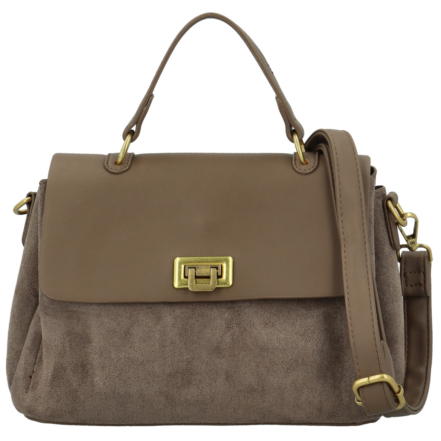 Klopa, poutko i popruh jsou vyrobeny z hladké koženky, zatímco tělo kabelky zdobí jemný semišový povrch, který jí dodává hloubku a sofistikovaný vzhled. Klopa se uzavírá stylovým zlatým zámečkem, jenž podtrhuje její ženský šarm.