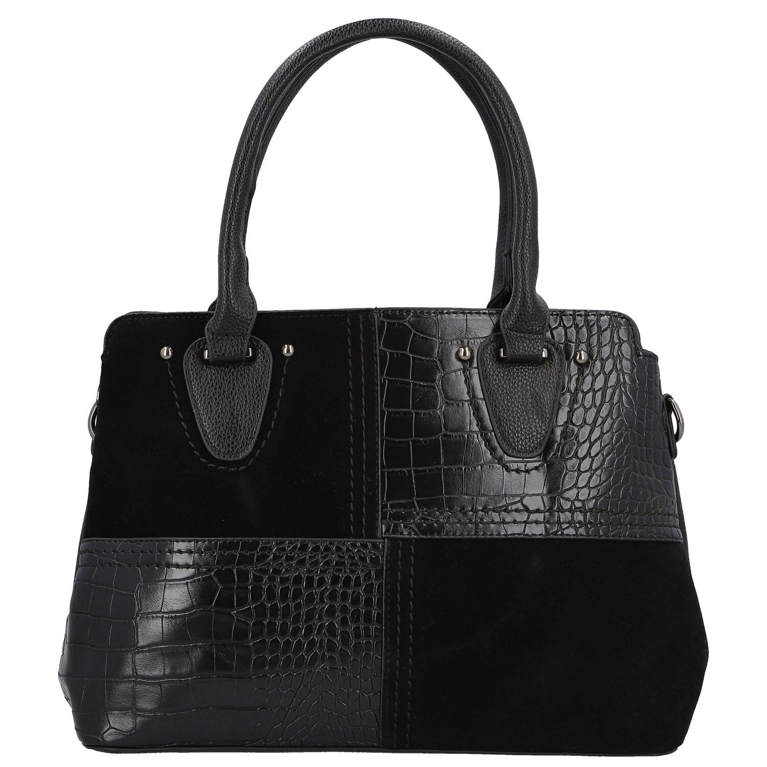 Přední část je rozdělena do obdélníků, přičemž šikmé protilehlé díly jsou vyrobeny z odlišných struktur - semišové koženky a hadího vzoru. Tento kontrast vytváří zajímavý a moderní vzhled. Zadní strana je naopak hladká a doplněná o praktickou kapsičku na zip.